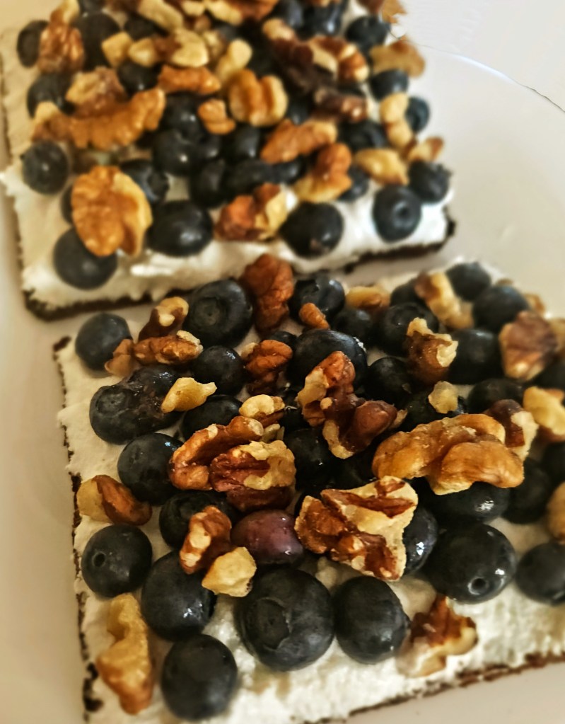 Mic dejun: Pâine prăjită cu brânză slabă de vaci, afine și nuci