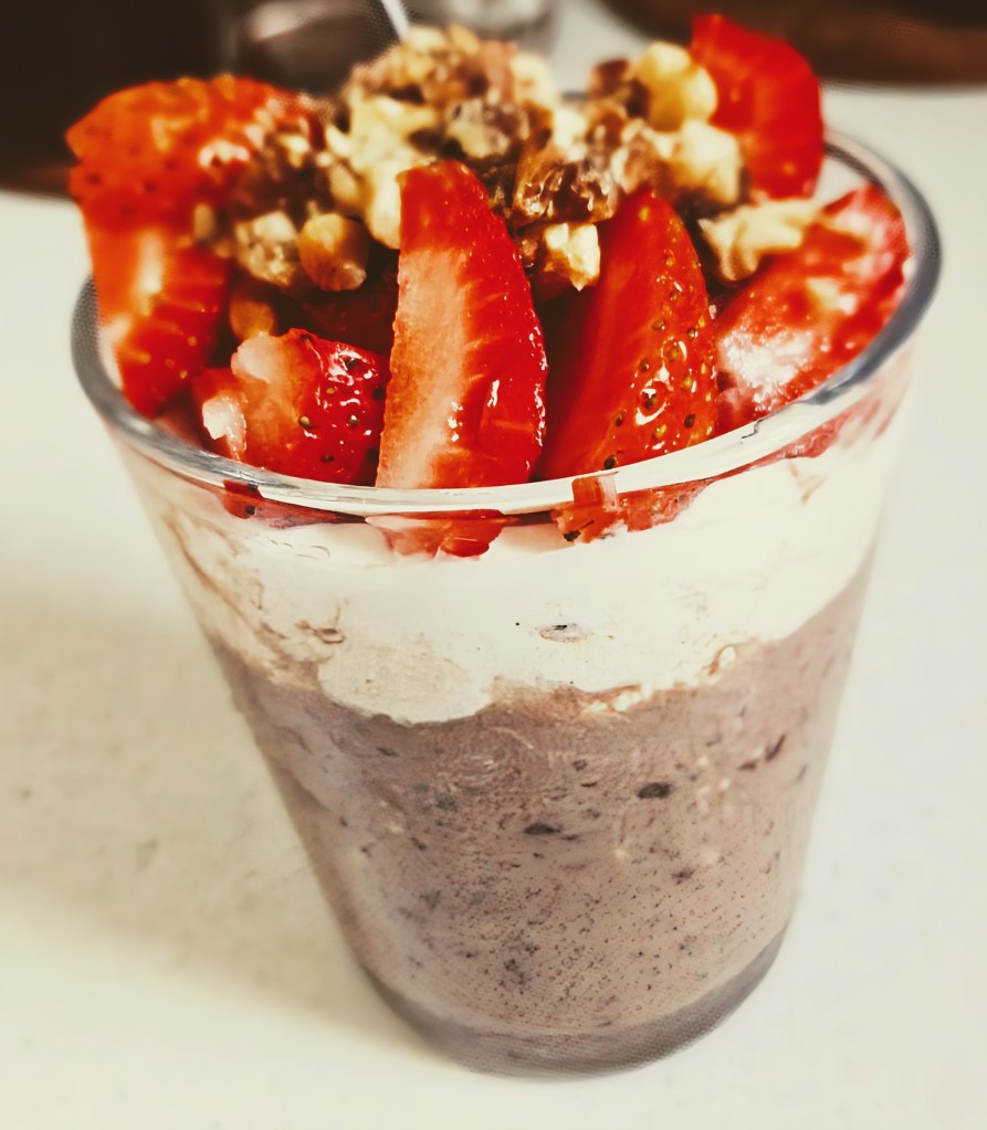 După un full body workout după prânz, am simțit nevoia de o mică gustare, așa că am înșfăcat din frigider una dintre ceștile cu budincă de chia pe care mi le-am pregătit în avans ca și gustări, sau desert. Am fiert chia în lapte de cocos și am pus un pic de cacao pentru puțin mai multă sațietate. Am adăugat și un pic de iaurt gras, am tăiat 2-3 căpșuni, am sfărâmat o nucă să pară mai fancy și voila!