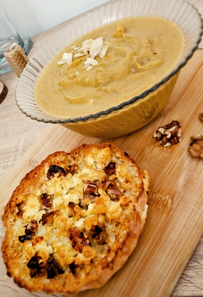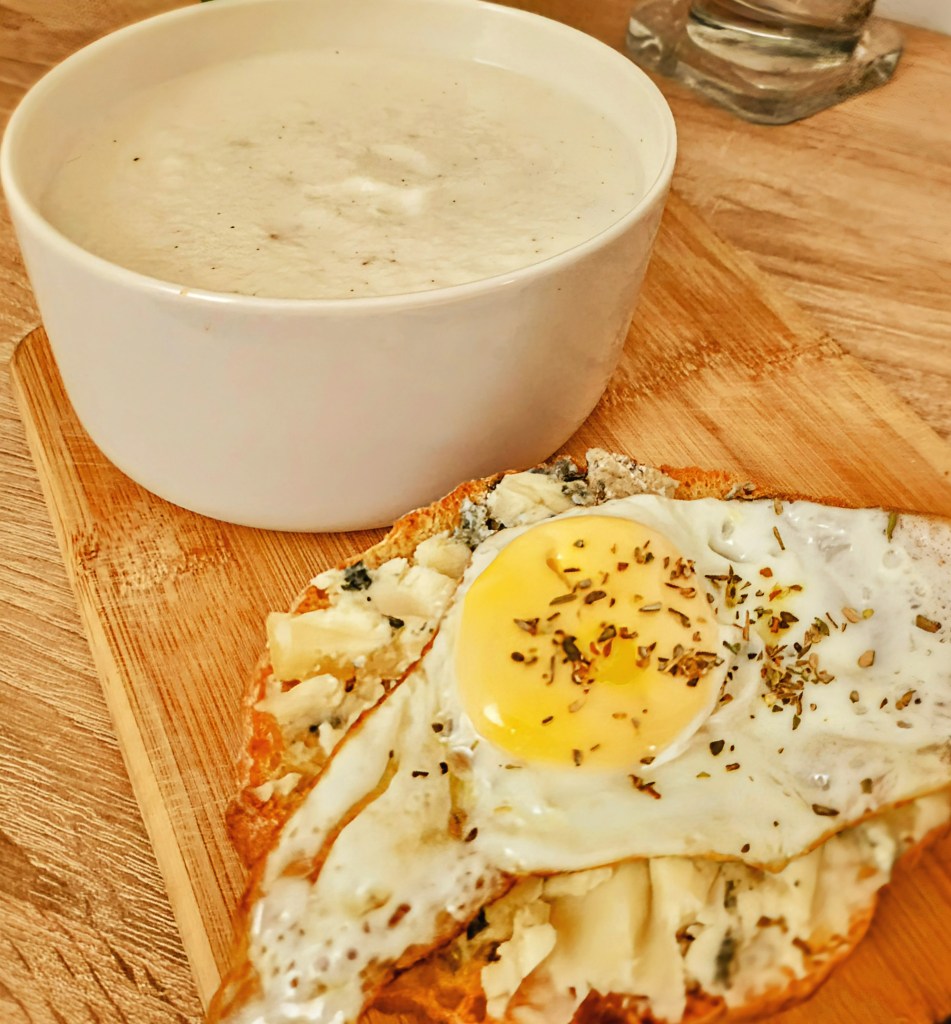 Am aruncat repede niște conopidă la fiert, am pasat-o și am adăugat lapte de capră și smântână de gătit, cam 50 ml din fiecare, sare și piper după gust și vreo 2 căței modești de usturoi. Am lăsat aromele să se împrietenească la foc mic și voila! Iar pentru că supa mea s-ar fi întristat fără companie, am băgat în airfryer jumătate de chiflă, peste care am uns puțină gorgonzola și am încununat-o cu un ou ochi.