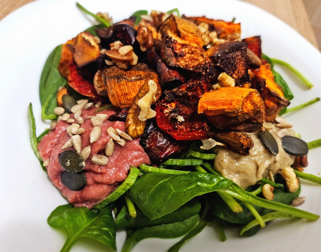 Inspirația pentru farfuria mea colorată a fost brunch-ul de la un loc’șor foarte fain pe la Romană, pe nume Crocant – voi vorbi și despre el, într-una dintre poveștile mele. Așa că am copt o vânătă întreagă în airfryer și am împărțit-o în 2. Prima parte am pasat-o cu sfeclă fiartă, pe a doua cu tahini și lămâie (clasicul moutabal). Nu puteau lipsi din farfurie morcovii cu ardeii copți pe pat de spanac și semințe.