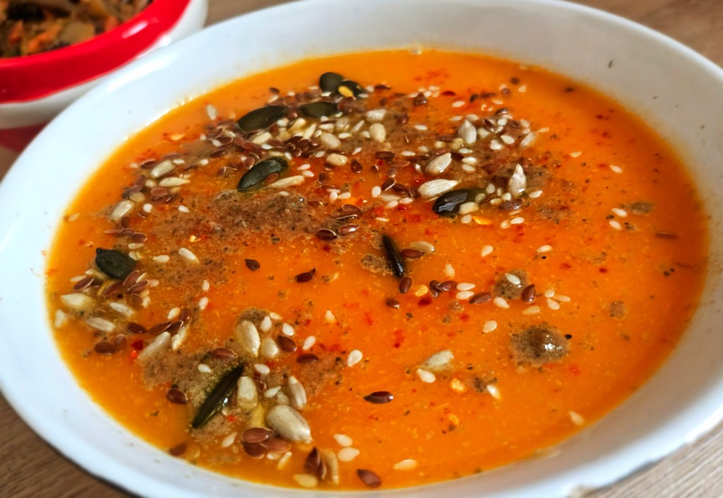 Nu te întrista, ci fierbe o jumătate de țelină mai mare, un morcov, o jumătate de cartof dulce, sare și doi căței de usturoi și blenduiește-le bine, până ai obținut frumusețea asta. Poți să-i pui și ceva nuci sau semințe, să fie cu un pic de crunch și iată, te-ai înveselit numai privind minunăția asta cremoasă 🙂