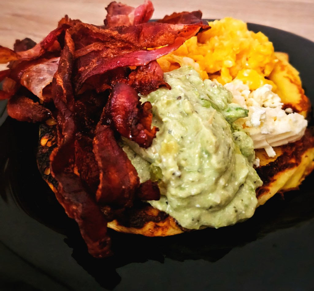 Deci am început cu un pancake mai maricel așa pe care am așternut un scrambled egg, puțină brânză de burduf, bacon și brânză de vaci cu avocado. Cum am facut baconul așa crispy? Airfryer, baby!