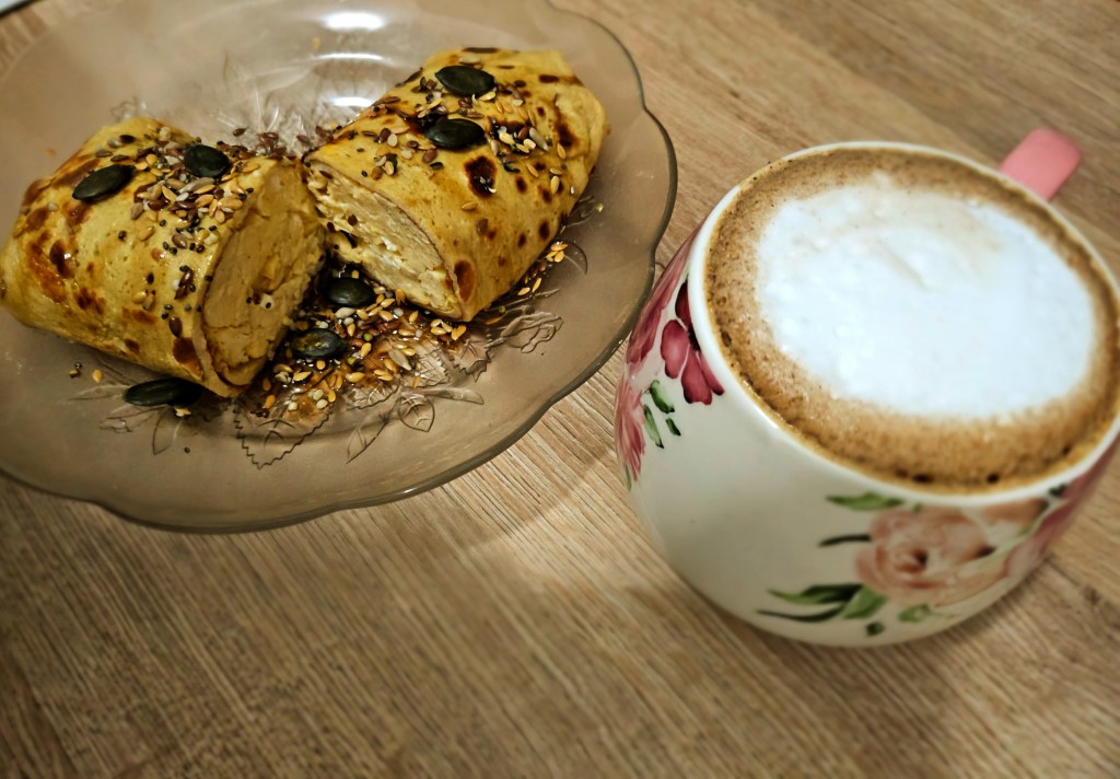 Mi-era o poftă nebună de clătite și de ouă, așa că am zis să fac o nebunie. Am trântit o clătită doar dintr-un ou cu puțină făină de hrișcă pentru aportul de carbs de dimineață, în care am aruncat un scrambled egg, obținând un wrap simplu, delicios și sățios.