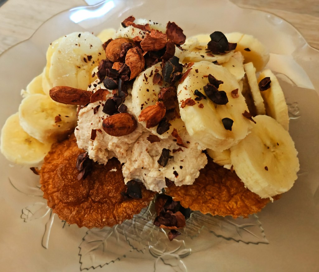 Am aruncat în blender pâinea, praf de copt, puțin lapte și esență de vanilie, iar 180° și 15 minute mai târziu, am obținut drăgălășeniile astea. Pentru cremă, am folosit cam 3 lingurițe de ricotta, cu 1 de pudra proteică. Am aruncat câteva felii de banană pentru extra-dulce și câteva boabe de cacao. Simplu, gustos și nutritiv.